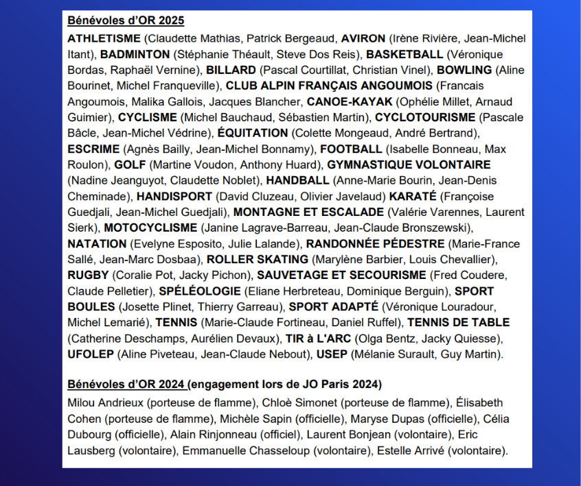 Le palmarès des « Bénévoles d’OR 2025 est composé de 66 lauréat.es (50% de femmes et 50% d’hommes) désignés paur leur Comité sportif.