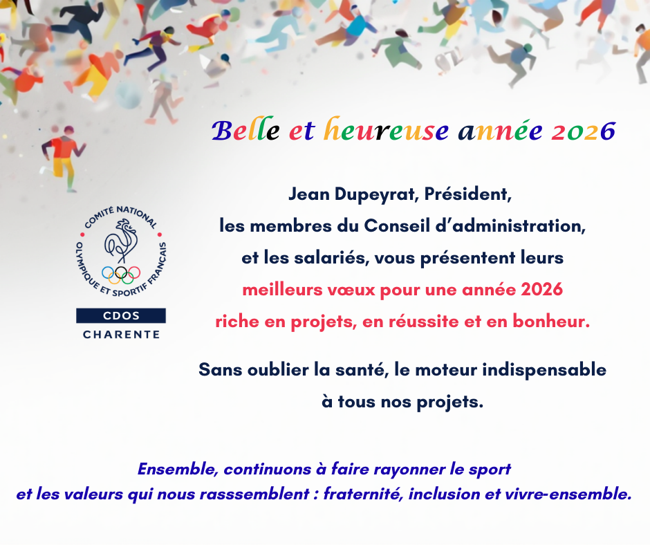 Le Comité olympique et sportif Charente adresse ses voeux les plus sincères et les plus chaleureux à toutes les forces vives du sport en Charente : Comités départementaux, clubs, pratiquants, entraineurs, officiels, juges, arbitres, dirigeants, bénévoles, institutionnels, partenaires et sympathisants. Que 2026 vous apporte la réussite, la prospérité et tout simplement le bonheur.
