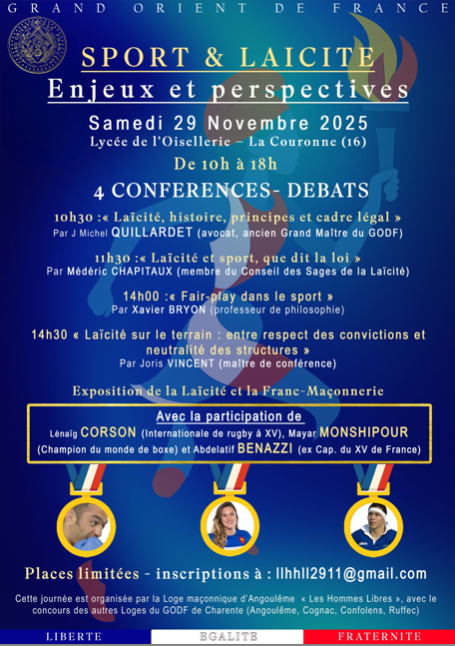 Dans le cadre du 120ème anniversaire de la promulgation de la loi de séparation des Eglises et de l’Etat, une journée « Sport et Laïcité, enjeux et perspectives «   se tiendra samedi 29 novembre 2025 au lycée de l’Oisellerie à La Couronne, de 10h à 18h.