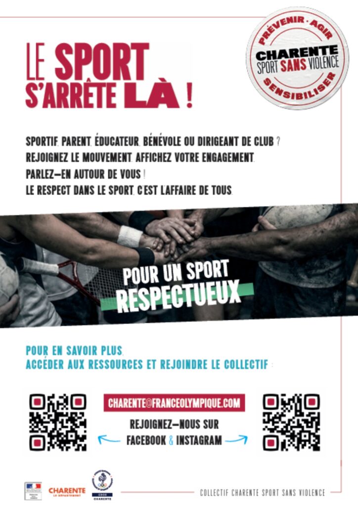 Le collectif « Charente, sport violence » organise durant le mois de mai une campagne de communication pour un sport sans violence. Des actions seront également organisées sur des temps forts de la vie des Comités : tournois, finales de coupe…